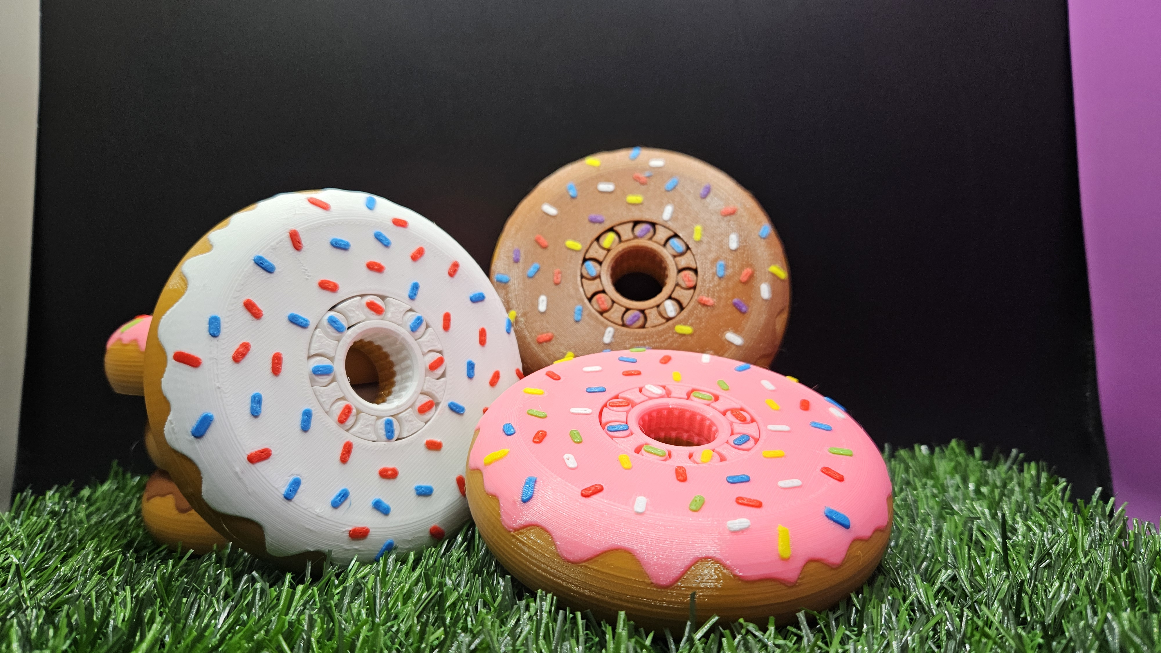 This mini utilizes a 3D printed bearing (with spinning sprinkles) design and can spin on your finger! The design and color were inspired by my favorite donut flavors and famous donut colors.